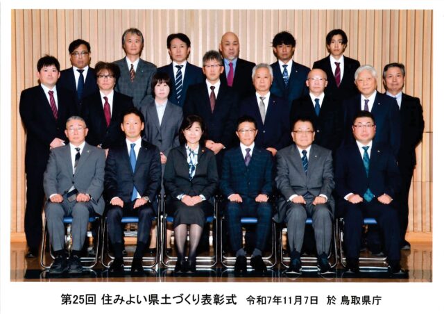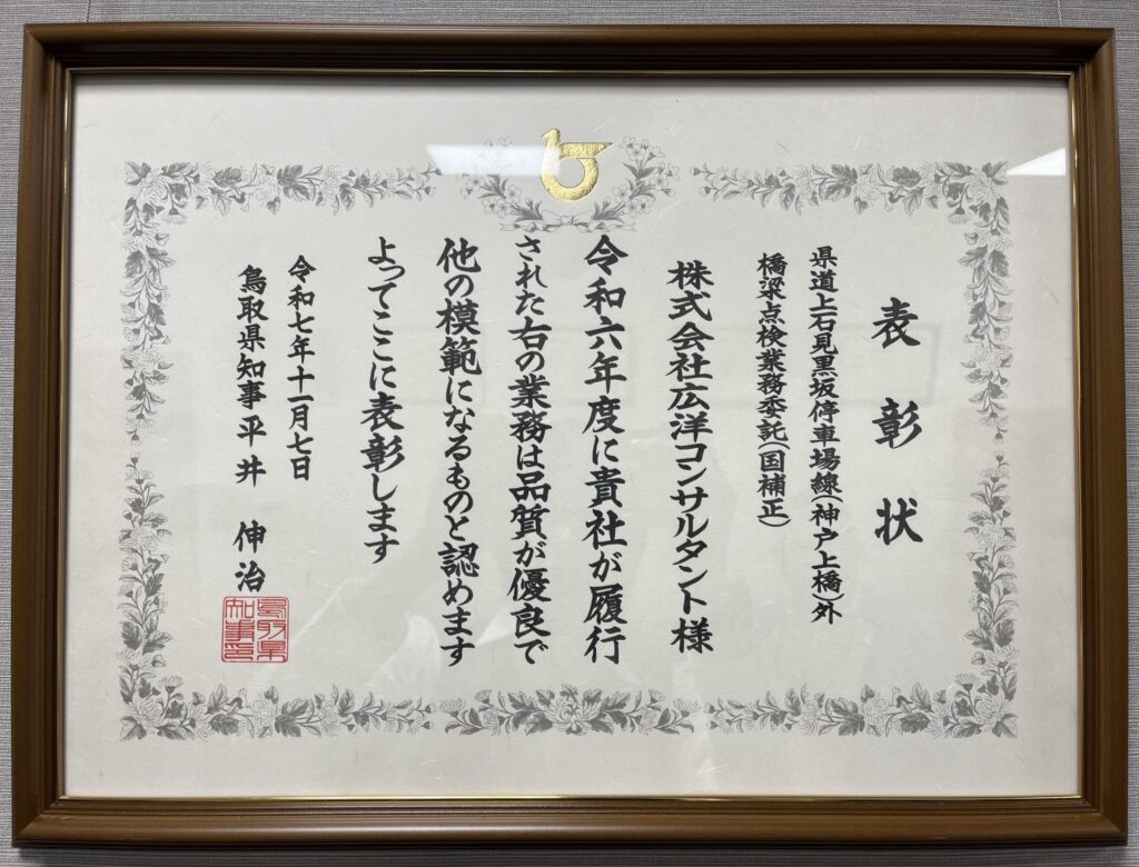 2025.11.12 令和7年度 鳥取県 優良業務表彰を受賞しました。 この度、令和7年度鳥取県優良業務として、鳥取県西部総合事務所 日野振興センター発注の 「県道上石見黒坂停車場線(神戸上橋)外橋梁点検業務委託(国補正)」が、 優良な業務を行った受注者として『優良業務表彰』を受賞しました。 令和7年11月7日(金)鳥取県庁にて表彰式が行われ、弊社を代表して担当技術者である、 設計課 主任 鷲田が出席しました。 今後も、技術力及び品質向上に努めてまいります。